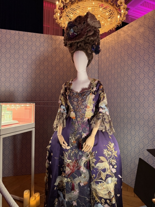 Neben den Armreifen, Halsketten und Schmuckstücken wurden in dem kleinen Raum verschiedene Originalkostüme aus den vergangenen Staffeln von Bridgerton ausgestellt – unter anderem prächtige Roben von Daphne und Eloise Bridgerton sowie ein eindrucksvolles Gewand von Queen Charlotte – inklusive einer ihrer markanten Perücken, für die die Queen in der Serie bekannt ist.