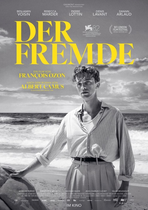 François Ozons Adaption des Romans „L’Étranger“ von Albert Camus (erschienen 1942) beginnt mit Bildern von Algier in den dreißiger Jahren. Ein Moderator preist die Hauptstadt der damaligen französischen Kolonie Algerien als Melting Pot aus arabischer Exotik und europäischer Grandezza. Dann folgt der jähe Schnitt in ein Gefängnis. Zwei Wärter schubsen einen jungen Europäer in eine Massenzelle voller Einheimischer. Ein Mitinsasse fragt ihn, warum er hier sei. Als Antwort kommt kühl: „Ich habe einen Araber getötet!“ Der furchtlos Ehrliche hört auf den Namen Mersault (Benjamin Voisin). Der Film entblättert, wie er dort landete. Nach dem Tod seiner Mutter erledigt er ungerührt die Trauerformalitäten. Kurz danach bandelt er mit seiner Bekannten Marie (Rebecca Marder) an. Er stellt ihr seinen Nachbarn Raymond (Pierre Lottin) vor. Der halbseidene Mann, gerüchteweise Zuhälter, neigt zu häuslicher Gewalt. Leidtragende ist Djemila, seine algerische Mätresse. Ihr Bruder Moussa sinnt deshalb auf Rache. Dann lädt Raymond Marie und Mersault in sein Ferienhaus am Meer ein. Plötzlich taucht dort auch Moussa auf. Eines heißen Sommertages erschießt Mersault ihn kaltblütig am Strand – eine seltsam unmotivierte Gräueltat, die er im folgenden Gerichtsprozess weder erklären kann noch will.