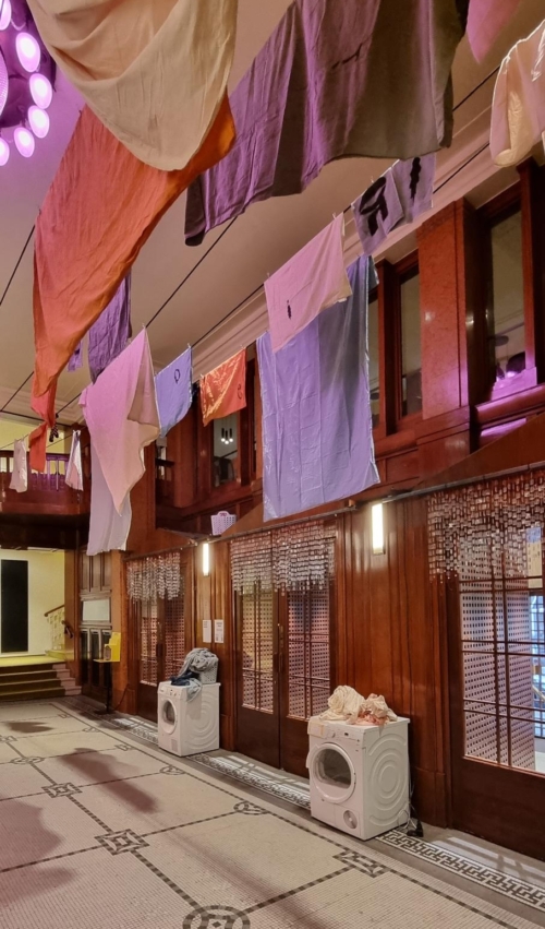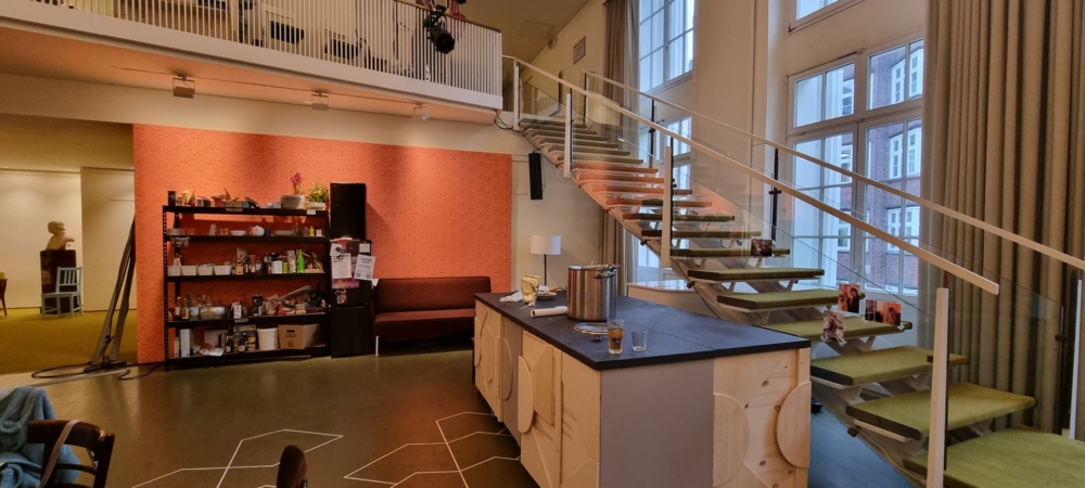 Amber: Da wir Studierende aus Düsseldorf sind, haben wir überlegt, wie wir denn überhaupt in einer Stadt, aus der wir nicht kommen und an einem Theater, was die meisten von uns nicht kennen, Gastfreundschaft etablieren können. Es ging uns darum, eine intime Atmosphäre aufzubauen, den Rahmen zu finden, in dem wir die bestmöglichen Gastgeber:innen sein können. Für den Zeitraum der Lessingtage im Thalia einzuziehen war tatsächlich unsere erste und wohl beste Idee.