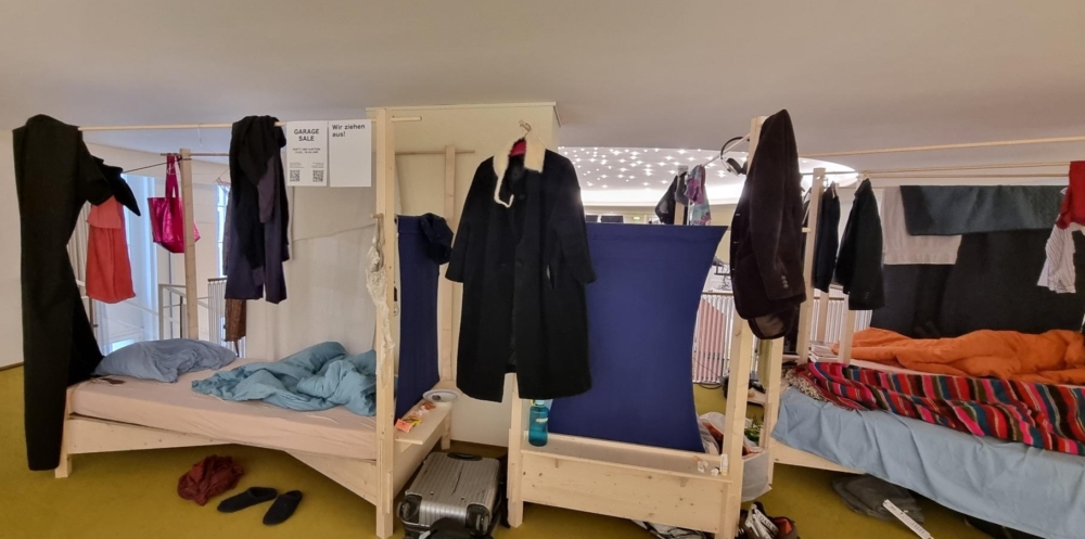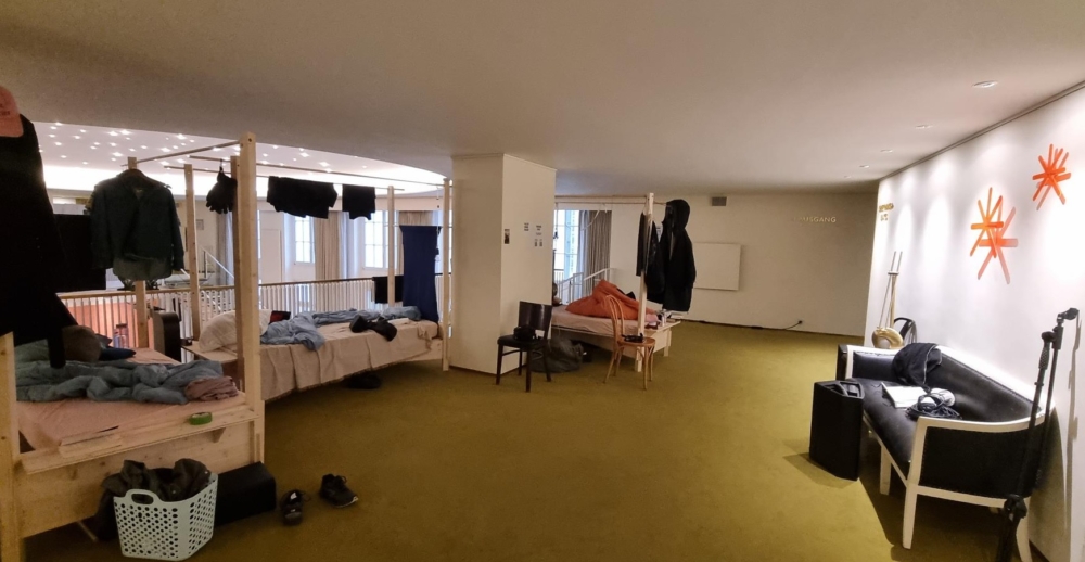 Seit bereits zwei Wochen leben die Studierenden im Thalia Theater. Besonders. Und das nicht etwa provisorisch auf Feldbetten – der Performance-Phase ging die Aufbauphase voraus, bei der sie bereits mitwirkten und sich mit Holzgestell-Betten, Sofas, Regalen und sogar Waschmaschinen und temporärer Küchenzeile einrichteten. SZENE HAMBURG hat sich mit den Studierenden Amber Theisen, Haley Hoyer und Marlene Raab in ihrem temporären Zuhause, dem Theater, getroffen und mit ihnen über ihre bisherigen Erfahrungen während des außergewöhnlichen Projekts gesprochen.