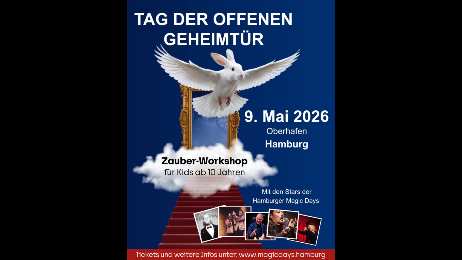 Beim „Tag der offenen Geheimtür“ am 9. Mai in der Gleishalle im Oberhafen Hamburg bringt der renommierte Hamburger Zauberkünstler Jan Logemann gemeinsam mit internationalen Stars der Zauberszene Kindern und Jugendlichen ab 10 Jahren in Workshops das Zaubern näher. Mit dabei sind Siegfried & Joy, Malin Nilsson, Thomas Otto, Carola Kärcher und Mario Lopez – eine hochkarätige Auswahl der Szene. Für das Non-Profit-Event sind noch einige wenige Tickets verfügbar. Es gibt zwei Durchgänge von 10:00 bis 12:30 Uhr und von 13:30 bis 16:00 Uhr mit jeweils maximal 200 Teilnehmenden. Kinder und Jugendliche ab 10 Jahren stehen klar im Fokus des Events, Erwachsene sind ebenfalls willkommen. Ermäßigte Tickets kosten 49,– €, Tickets für Erwachsene 89,– €. Mit der Buchung über unseren Link erhältst du 10% Rabatt.